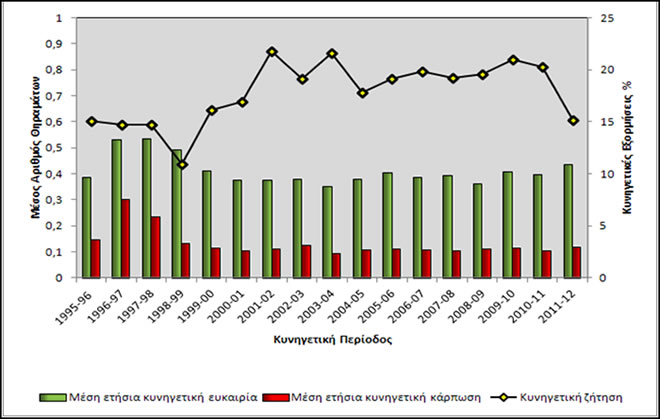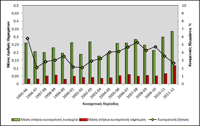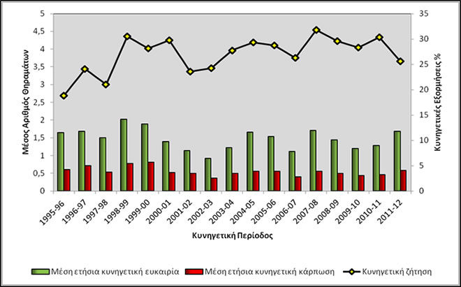 Γράφημα 1. Εξέλιξη των δεικτών θηραματικής αφθονίας του λαγού ανά έτος, από το 1995-1996 έως και το 2011-2012 σε ολόκληρη την ελληνική επικράτεια: Μέση ετήσια Κυνηγετική Ευκαιρία, μέση ετήσια Κυνηγετική Κάρπωση ανά κυνηγό και εξόρμηση και Κυνηγετική Ζήτηση.
